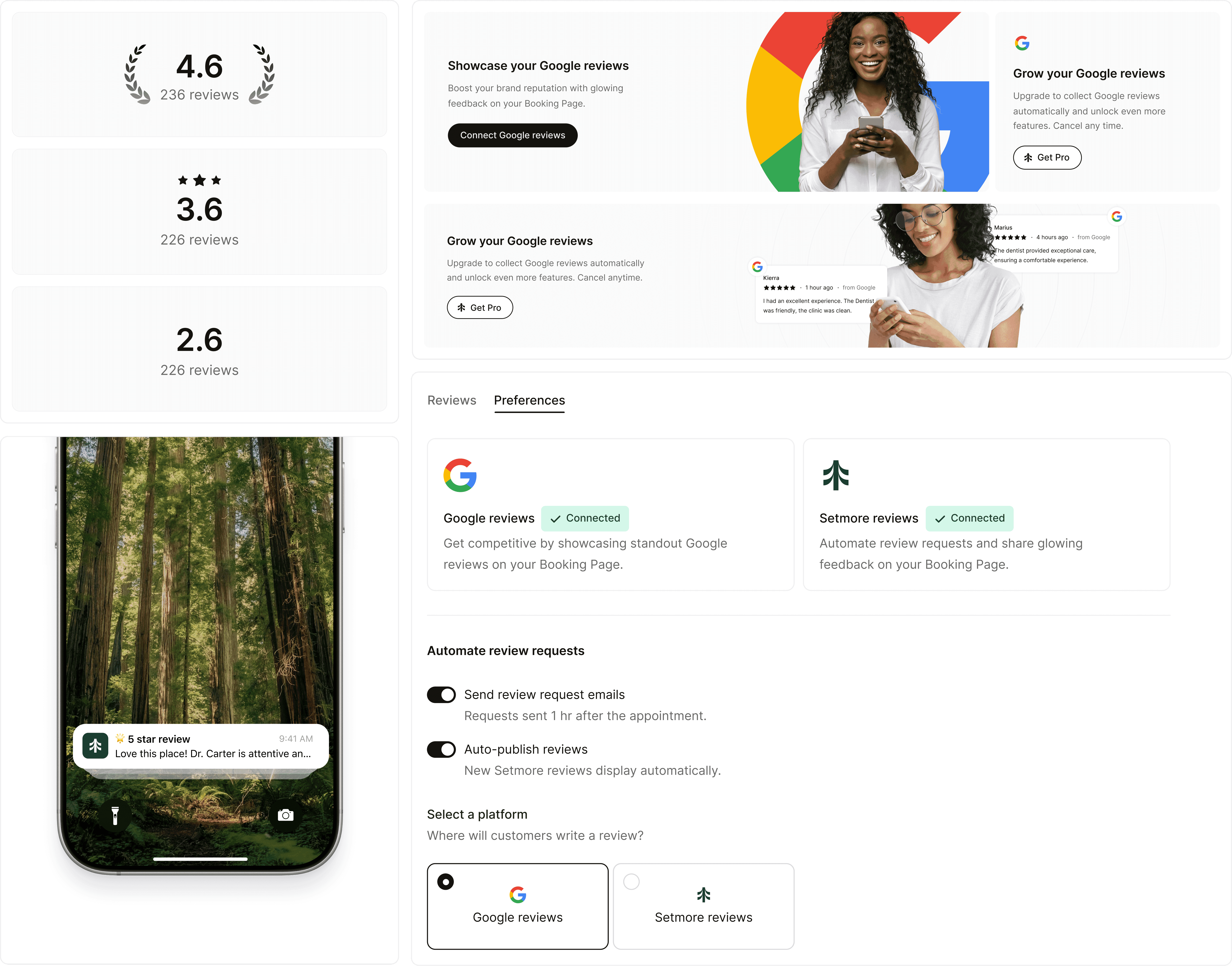 Showcase businesses’ existing Google reputation directly within the booking flow, while designing a natural upgrade path for those actively collecting reviews.