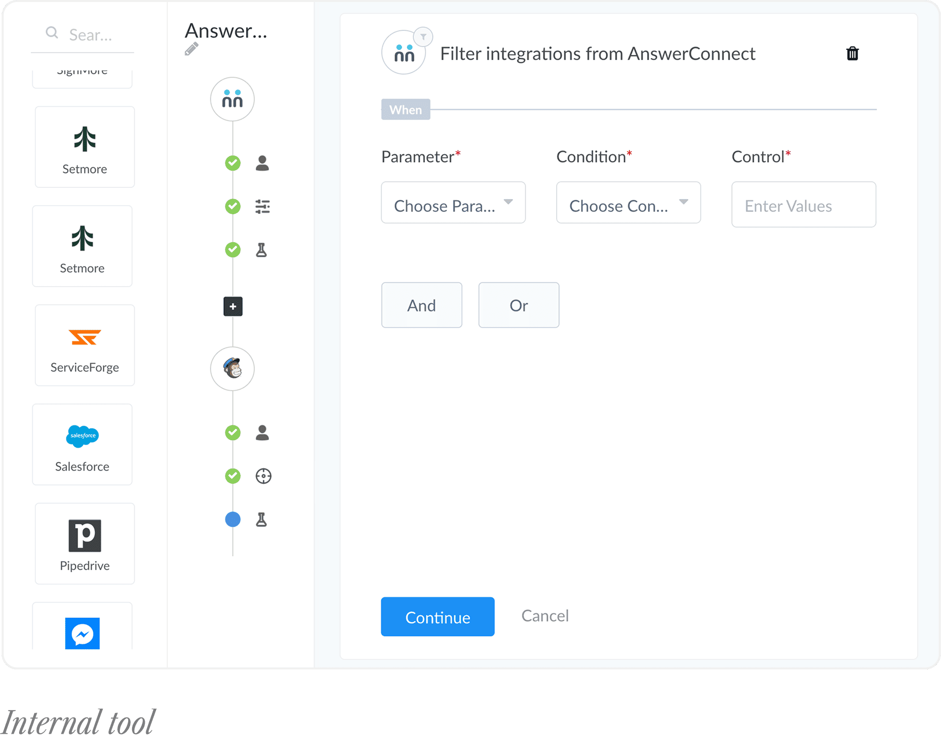 AnswerConnect: Customers interacted with a limited iframe-based tool, while the CAM team operated a separate internal system with full control. This created a hidden dependency, customers couldn’t complete more advanced setups.